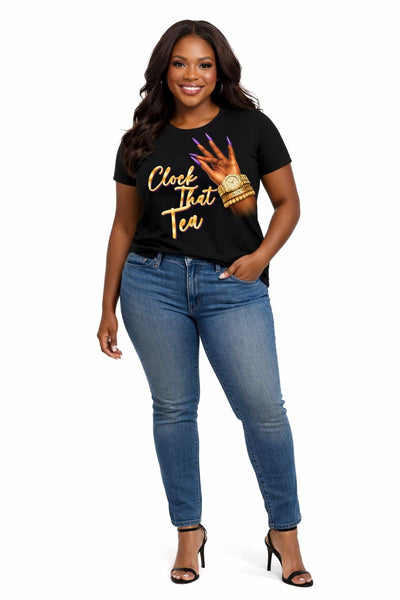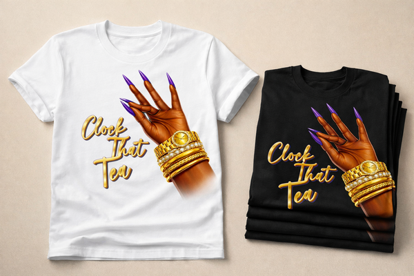 Personalized Clock That Tea T-shirt customized with your name or business name. Soft-style cotton tee with a smooth, comfortable fit and crisp vinyl lettering. Perfect for small business branding, vendor events, gifts, and everyday wear. Customize yours today.