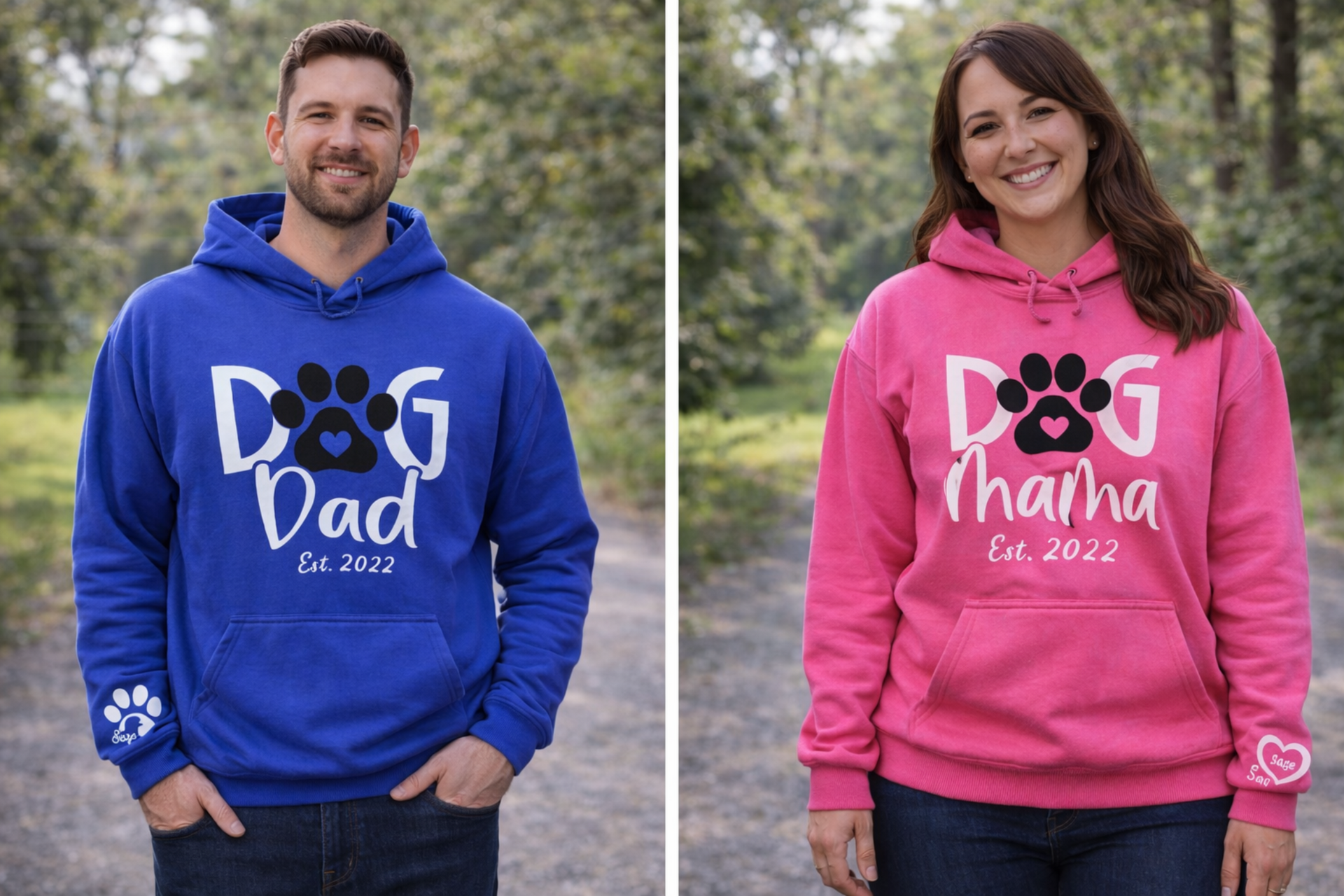 Customized Dog Mama hooded sweatshirt is made for cozy days and proud pet moms. Crafted from a soft, comfortable fleece blend, this hoodie features a stylish dog paw graphic on the front and a custom dog name design on the sleeve, making it personal and meaningful. Perfect for dog moms who love warmth, comfort, and showing off their fur baby in style. The black Paw is designed with special Flock Velvet feel material for an added designer look!