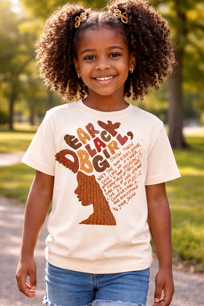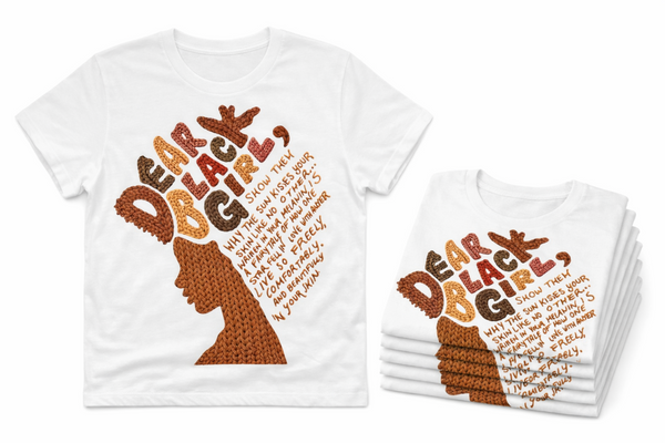 The Dear Black Girl tee is more than fashion — it’s affirmation, pride, and softness wrapped in strength. Designed with a rich, knit-inspired graphic and warm earth-tone hues, this piece celebrates melanin, resilience, and the beauty of simply being you.